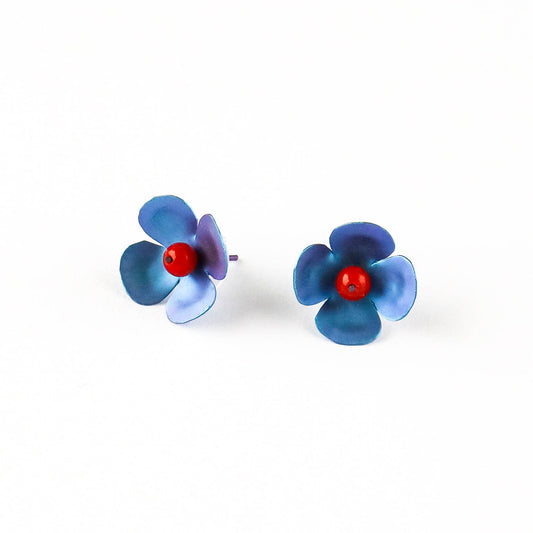 Medium Electric Blue Rounded 4-Petal Flower Studs with a Red Coral Bead