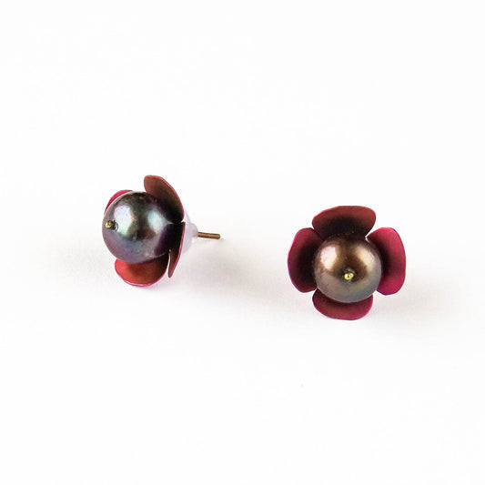 Medium Fuchsia Rounded 4-Petal Flower Studs with a Big Black Pearl