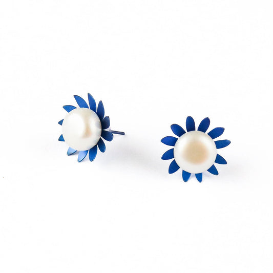 Blue 12-Petal Flower Studs with a Jumbo Pearl