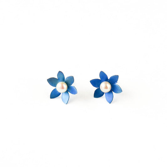 Petite Blue 6-Petal Flower Studs with a White Pearl