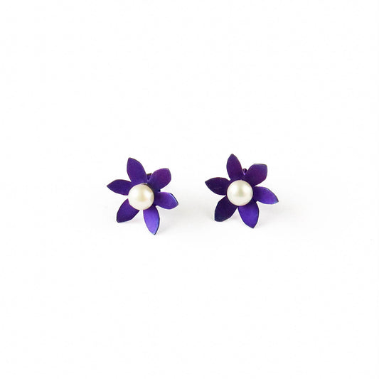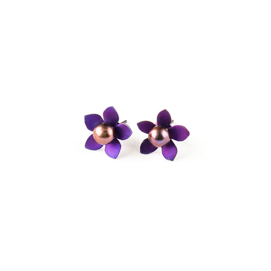 Petite Purple 6-Petal Flower Studs with a White Pearl