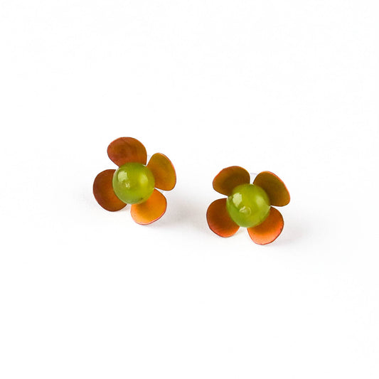 Dainty Golden-Brown 4-Petal Flower Studs with a Green Agate Beads