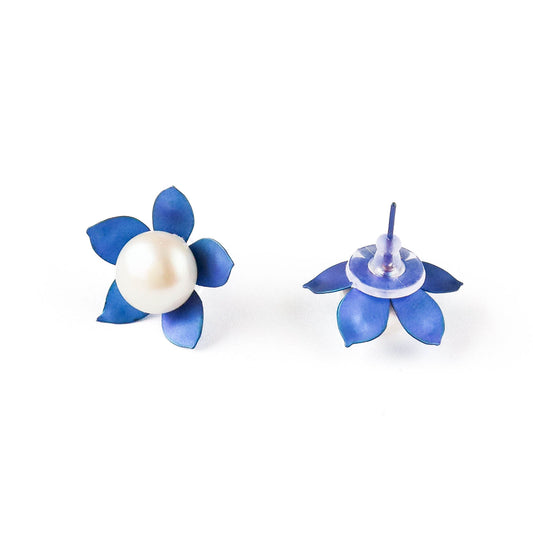 Blue 5-Petal Flower Studs with a Jumbo Pearl
